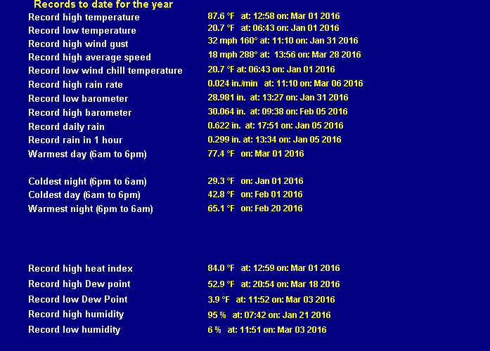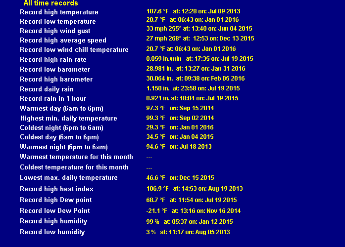 | Maximum rain per minute (last hour) | 0.000 in/min | Maximum rain per hour (last 6 hours) | 0.000 in/hour |