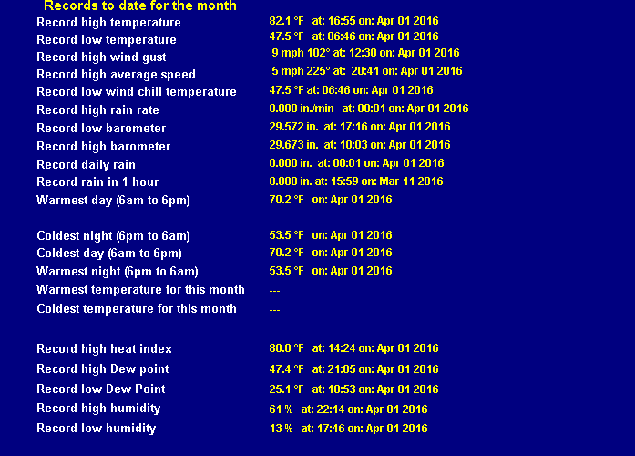 | Rainfall This month | 0.00 in. (0.0 mm) | Rainfall To date this year | 4.455 in. (113.2 mm) |