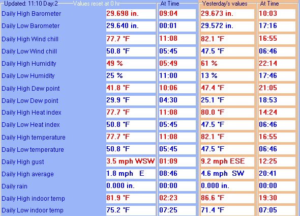 | Maximum Temperature (since midnight) | 77.7°F at: 11:08 | Minimum Temperature (since midnight) | 50.8°F at: 05:45 |