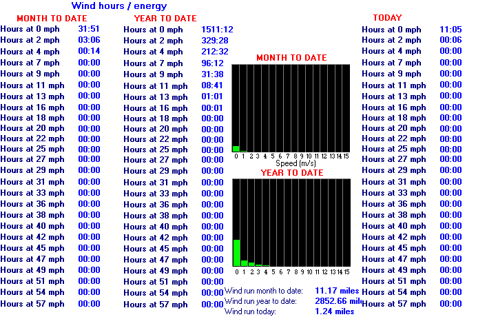 | Maximum Gust (since midnight) | 3 mph at: 01:09 | Maximum 1 minute average (since midnight) | 1.8 mph at: 08:46 |