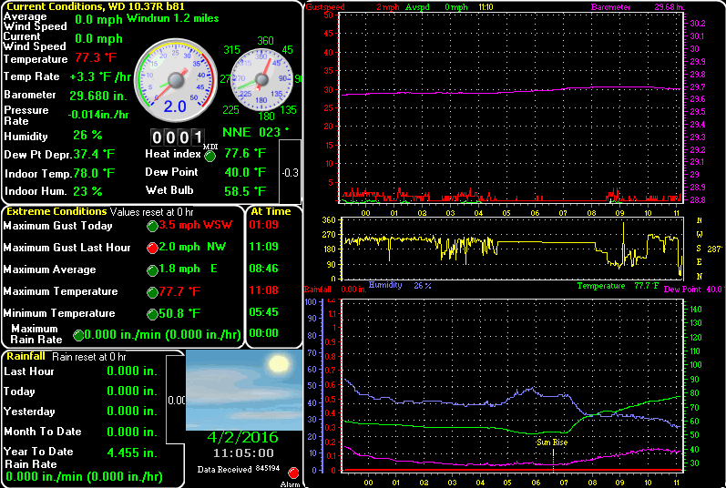 | Heat Index | 77.7°F | Maximum Gust (last hour) | 2 mph at: 11:09 |